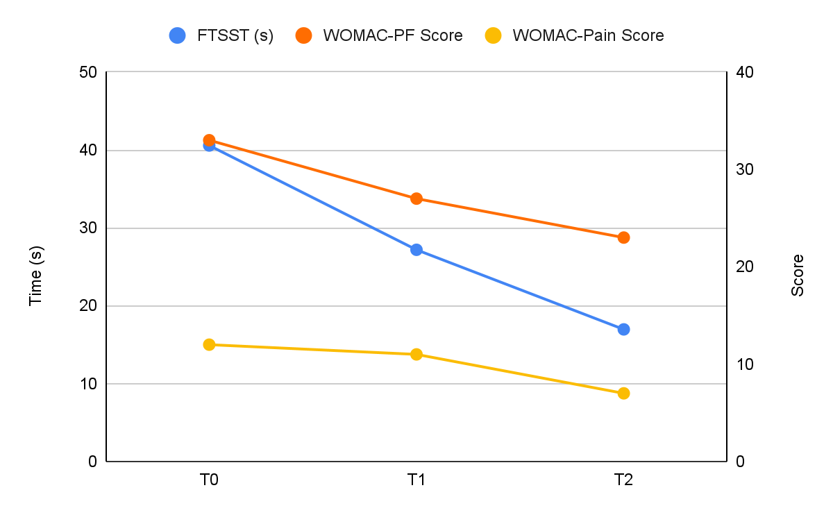 Functional capacity, assessed through the 6MWT and FTSST, showed improvement (Figures 2-3). The time required to complete the FTSST dropped from 40.57 s at T0 to 16.96 s at T2, indicating a reduction in functional limitations and improved muscle power/endurance. Patient-reported outcomes mirrored the objective changes, with the WOMAC-Physical Function score decreasing from 33 at T0 to 23 at T2, and the WOMAC Pain score decreasing from 12 at T0 to 7 at T2. Neither met the established MCID of 14.48 and 8.74.