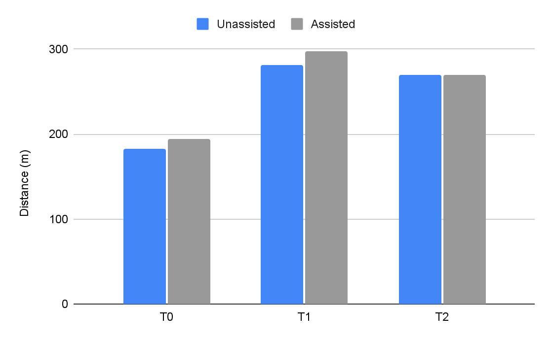 The participant’s functional endurance improved, with the distance walked increasing from 182.74 m (unassisted) at T0 to 270 m (unassisted) at T2. By T2, the acute effect of the sleeve was minimal, as assisted and unassisted distances were identical, suggesting the gains were not dependent on the immediate assistance of the device.