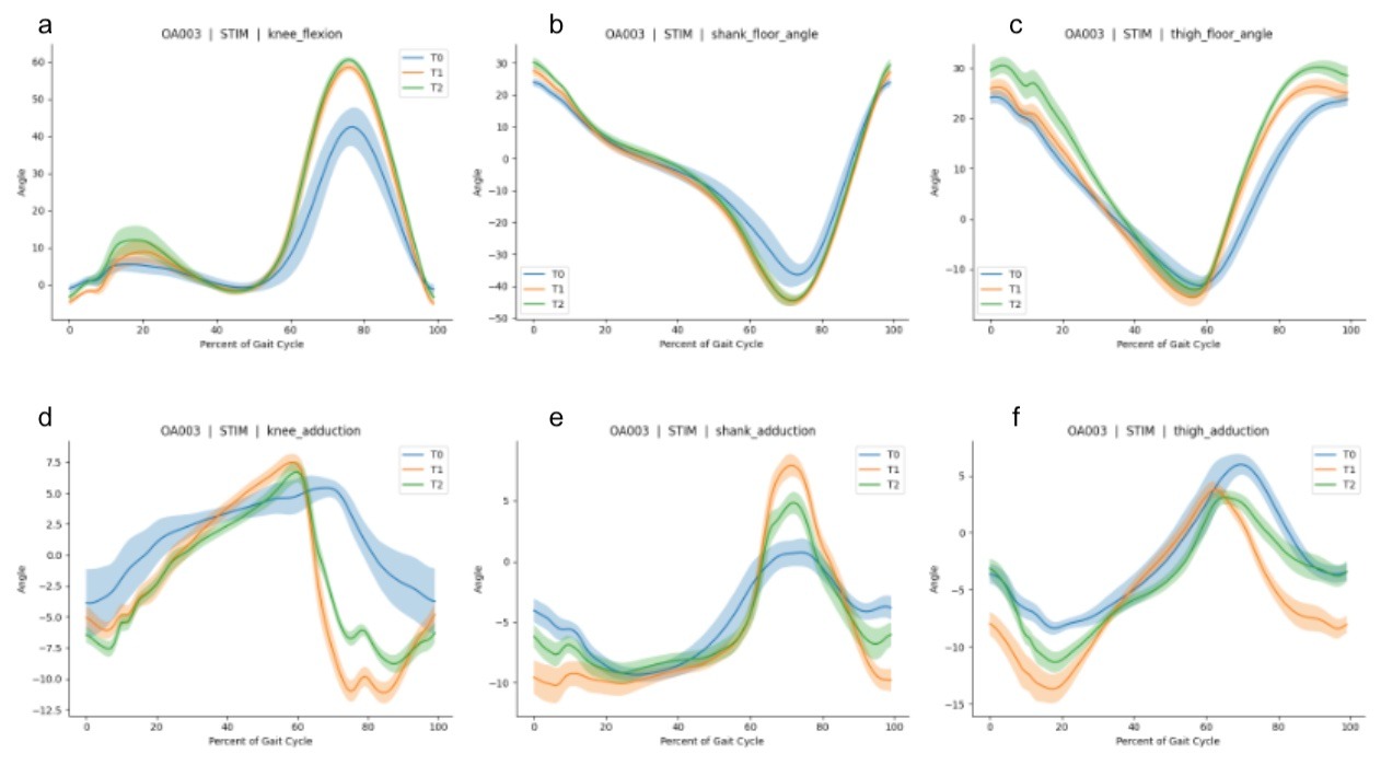 Kinematic analysis of stimulated gait across the three study visits demonstrated progressive changes in both the sagittal and frontal planes, indicating a positive alteration in the participant’s gait mechanics following the intervention. The most pronounced changes were observed in the sagittal plane, reflecting improved joint excursion.