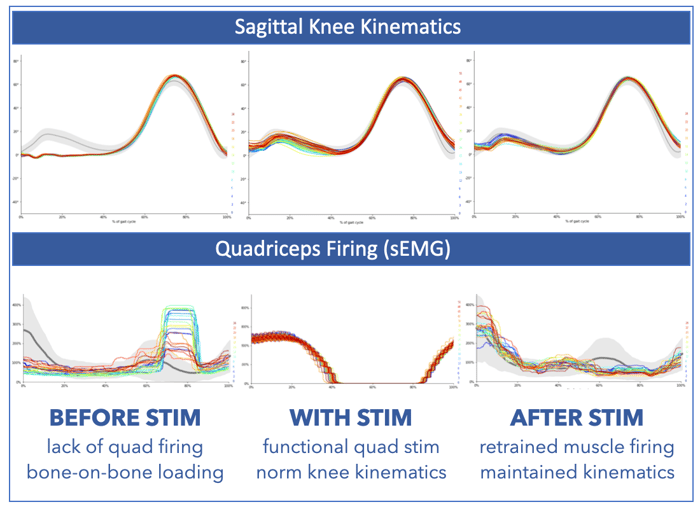 Based on the biomechanical data presented, this patient underwent neuromuscular electrical stimulation (NMES) therapy targeting quadriceps re-education during functional activities.